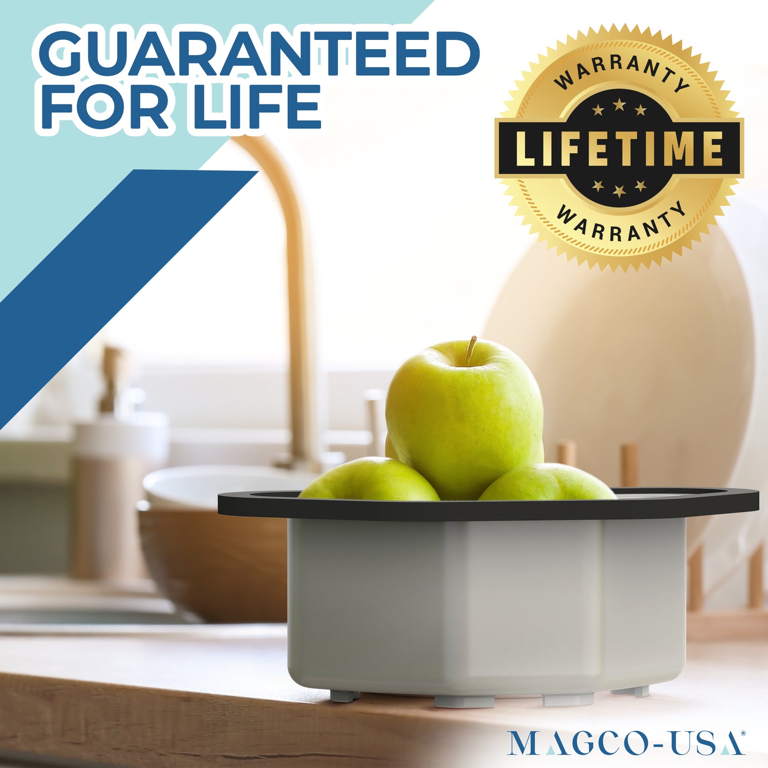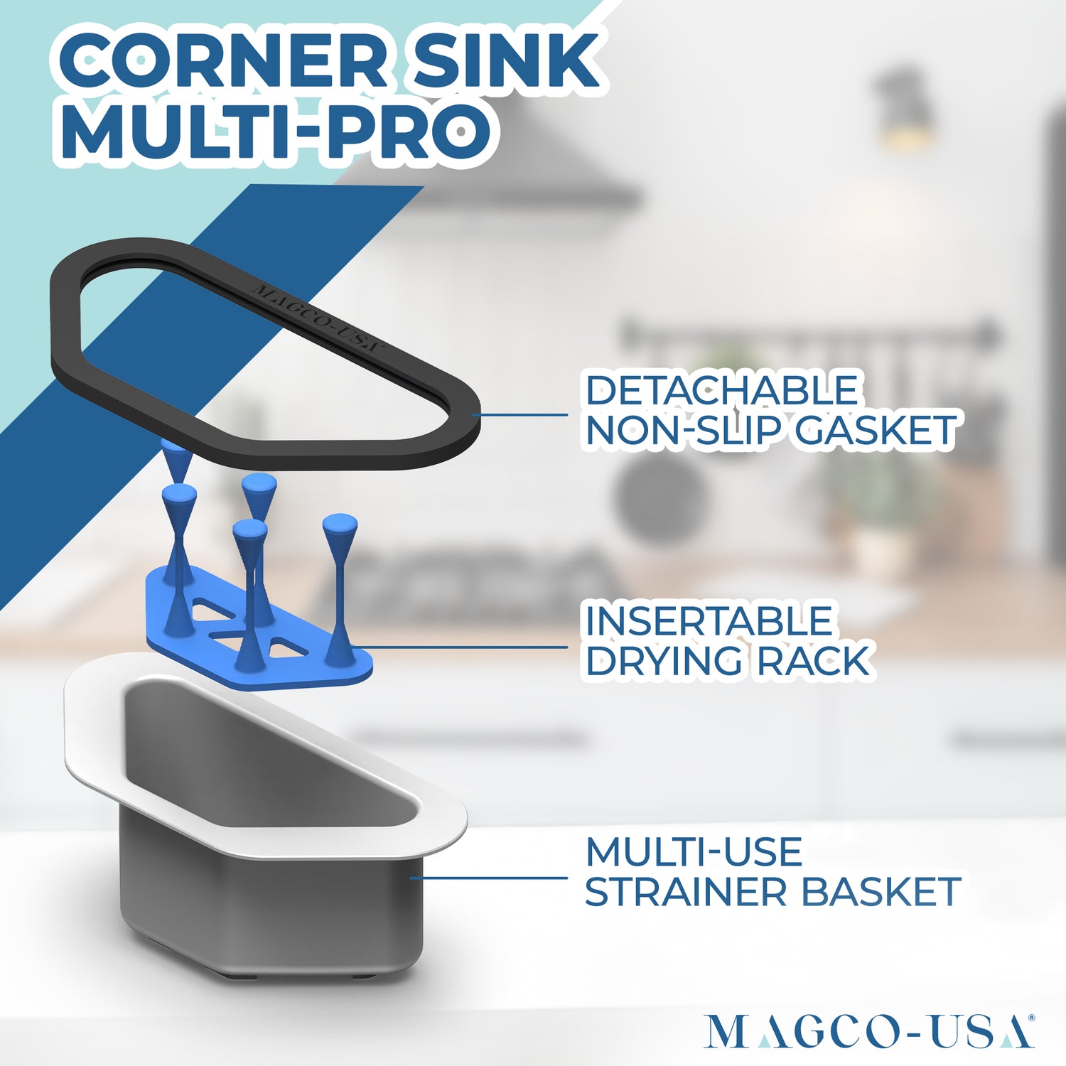 The big picture of the Magco-Usa Corner Sink Multi-Pro is quality! We found a niche in the market where the consumer was looking directly for a corner sink colander / storage item that was hands free and could be used as a “permanent use” item in the sink that aslo delivered plenty of storage space and function. Something that was space saving and above all else heavy duty! Our Patent Pending design will deliver just that.